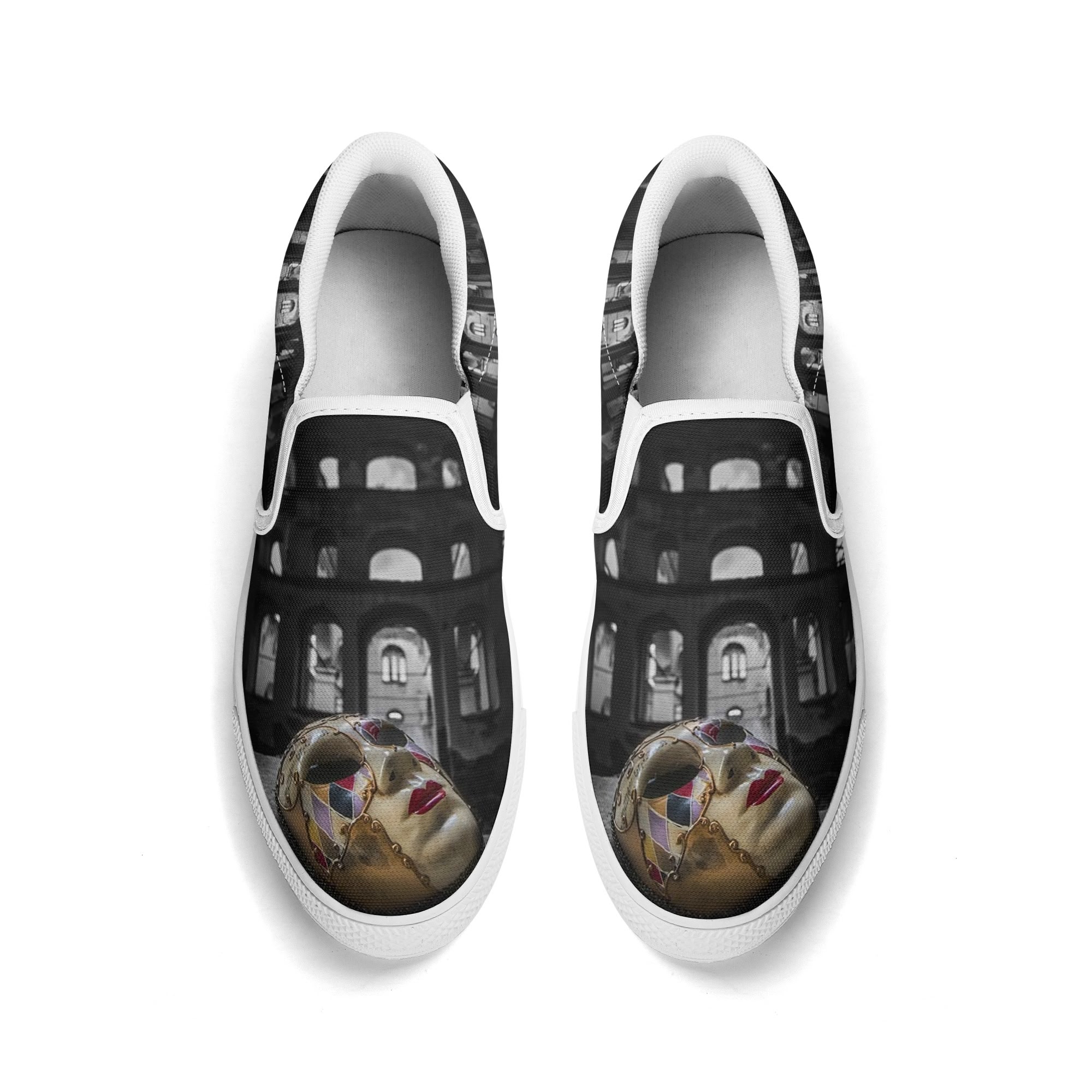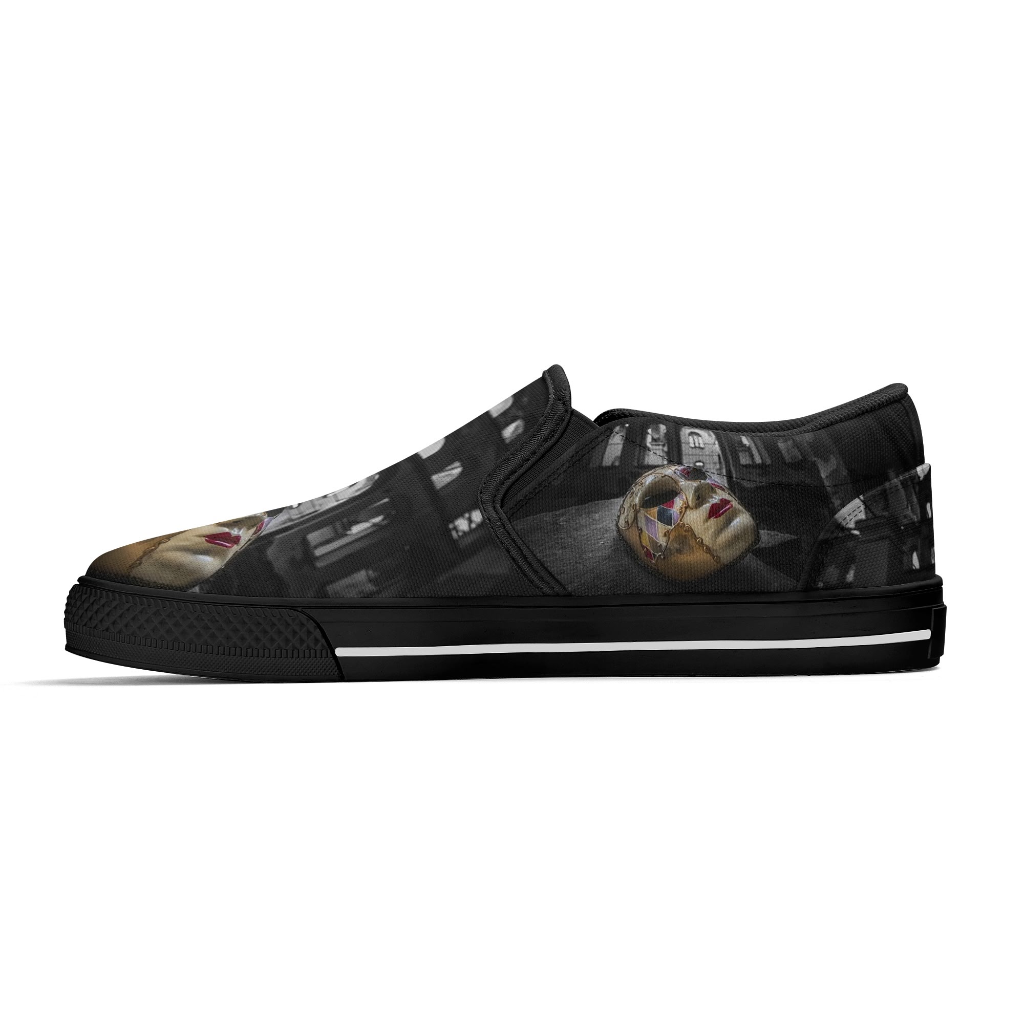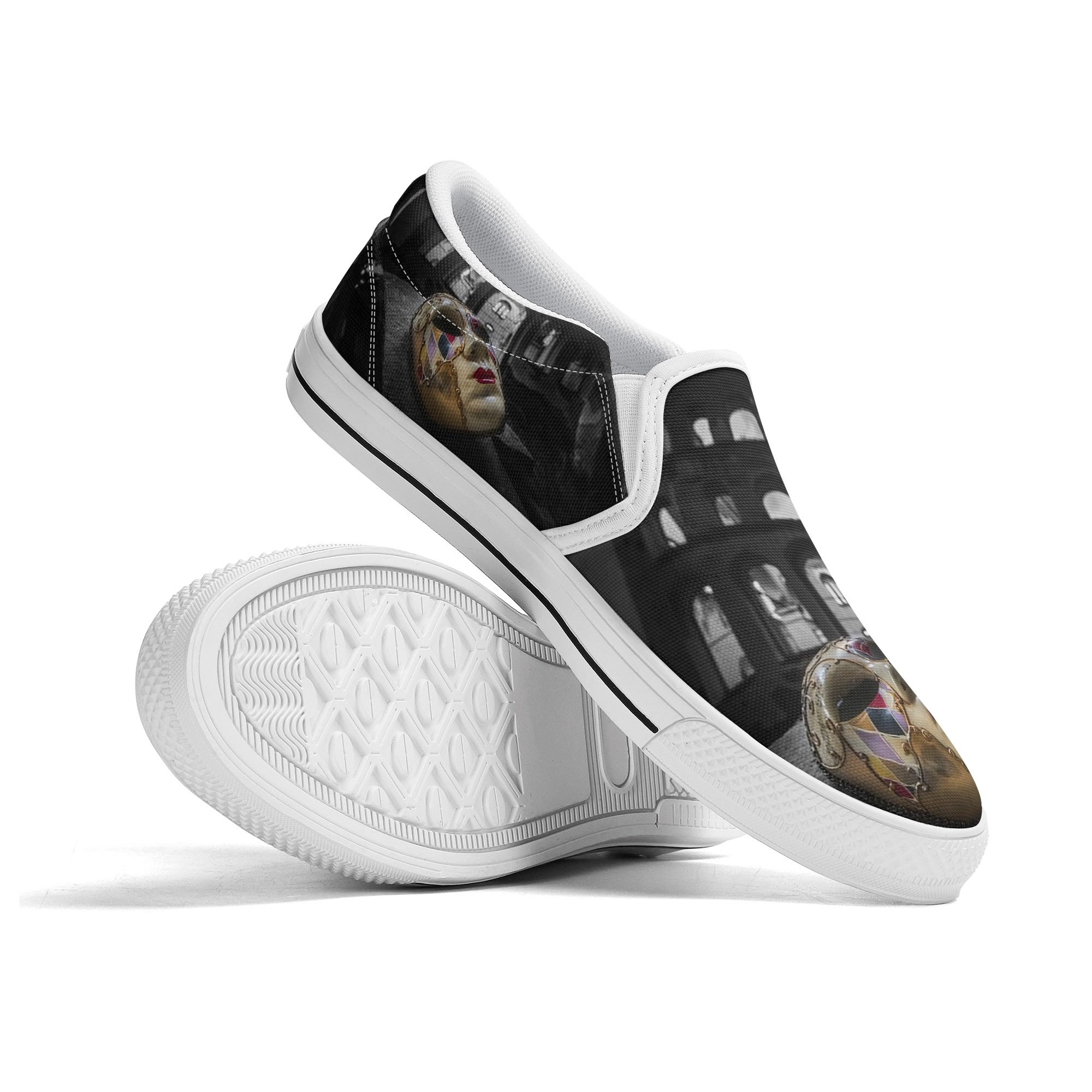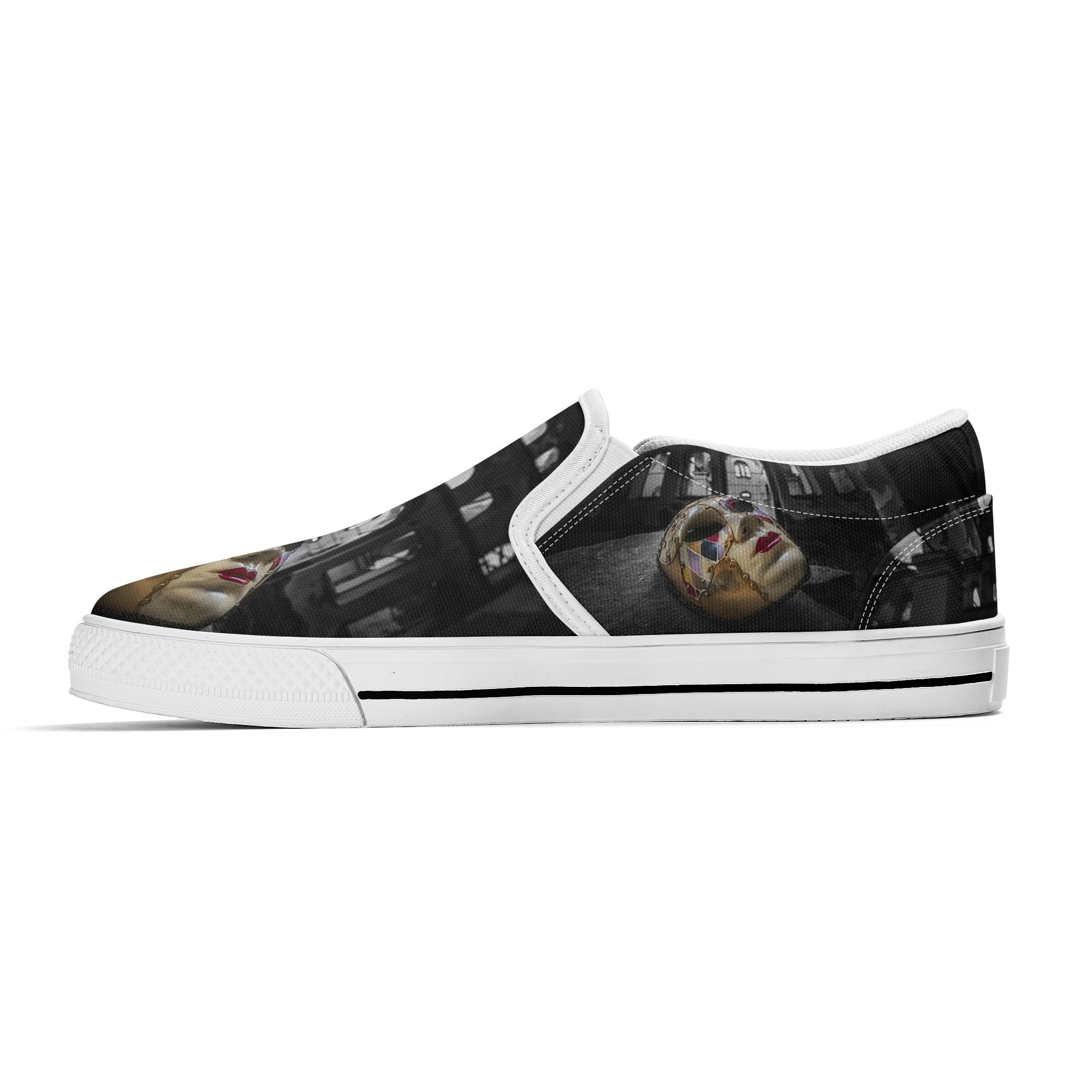 * Custom all over printed shoes with slip on style and elastic band construction for easy on and off.