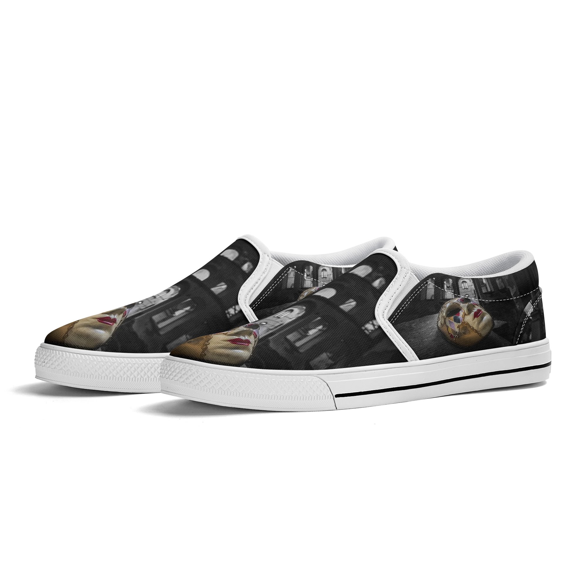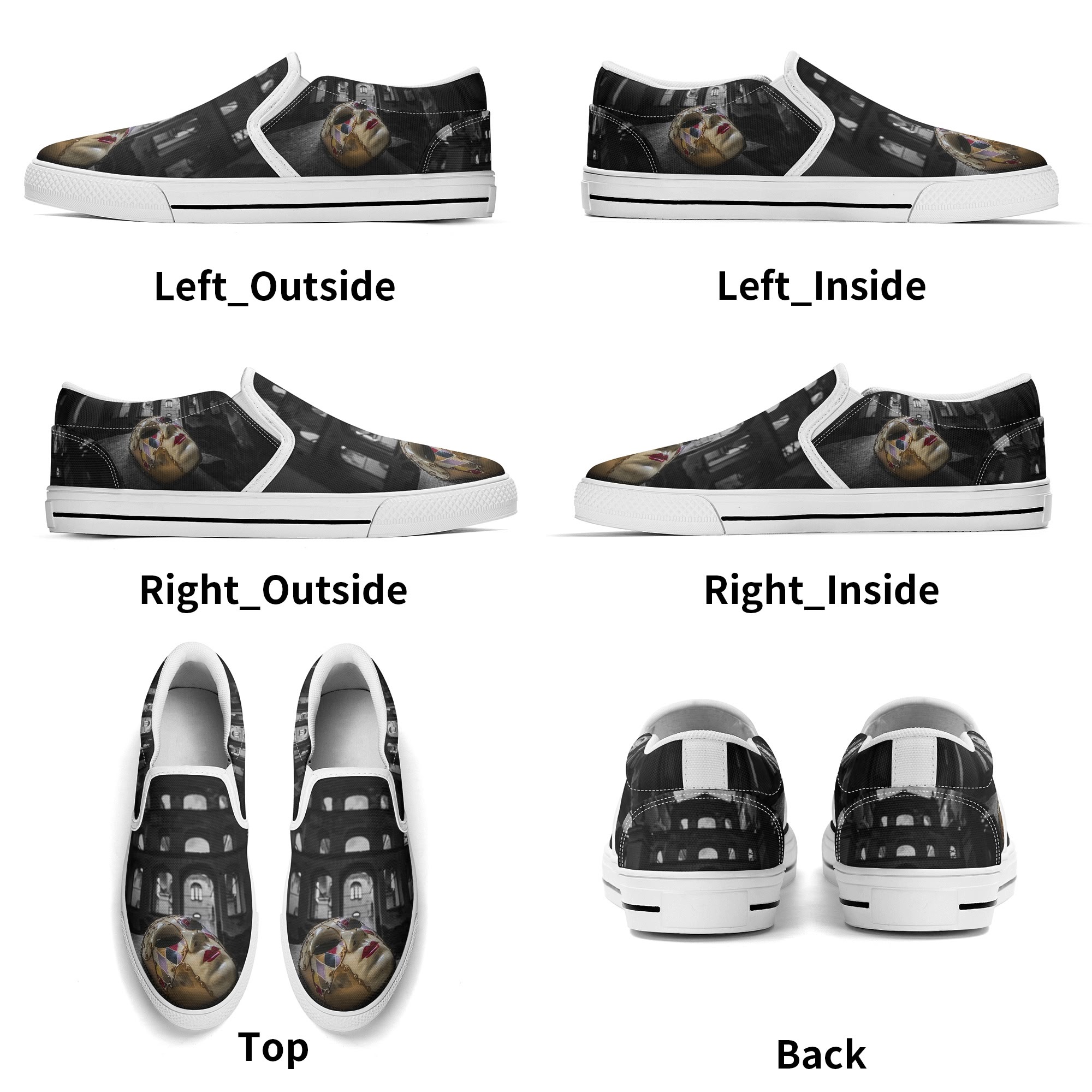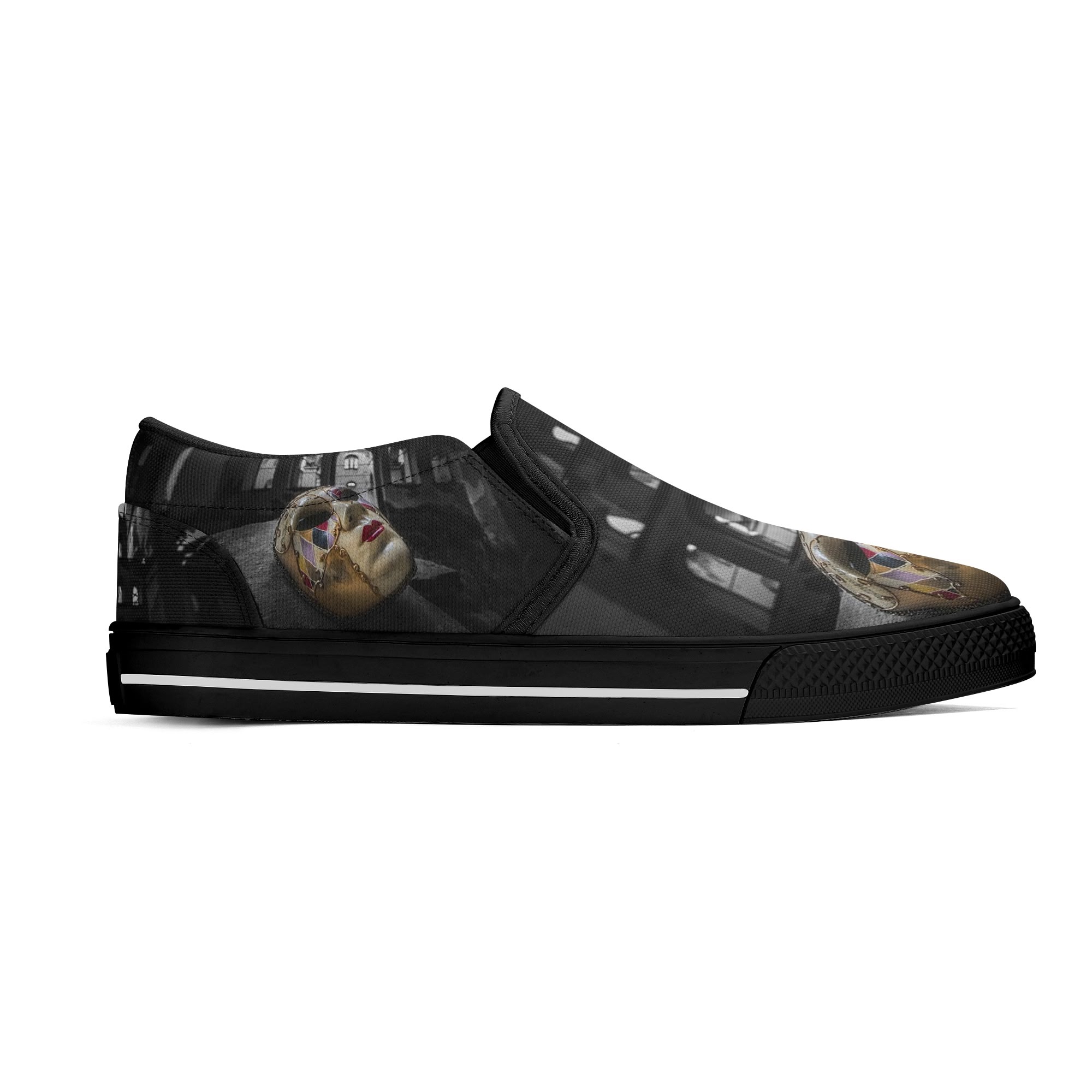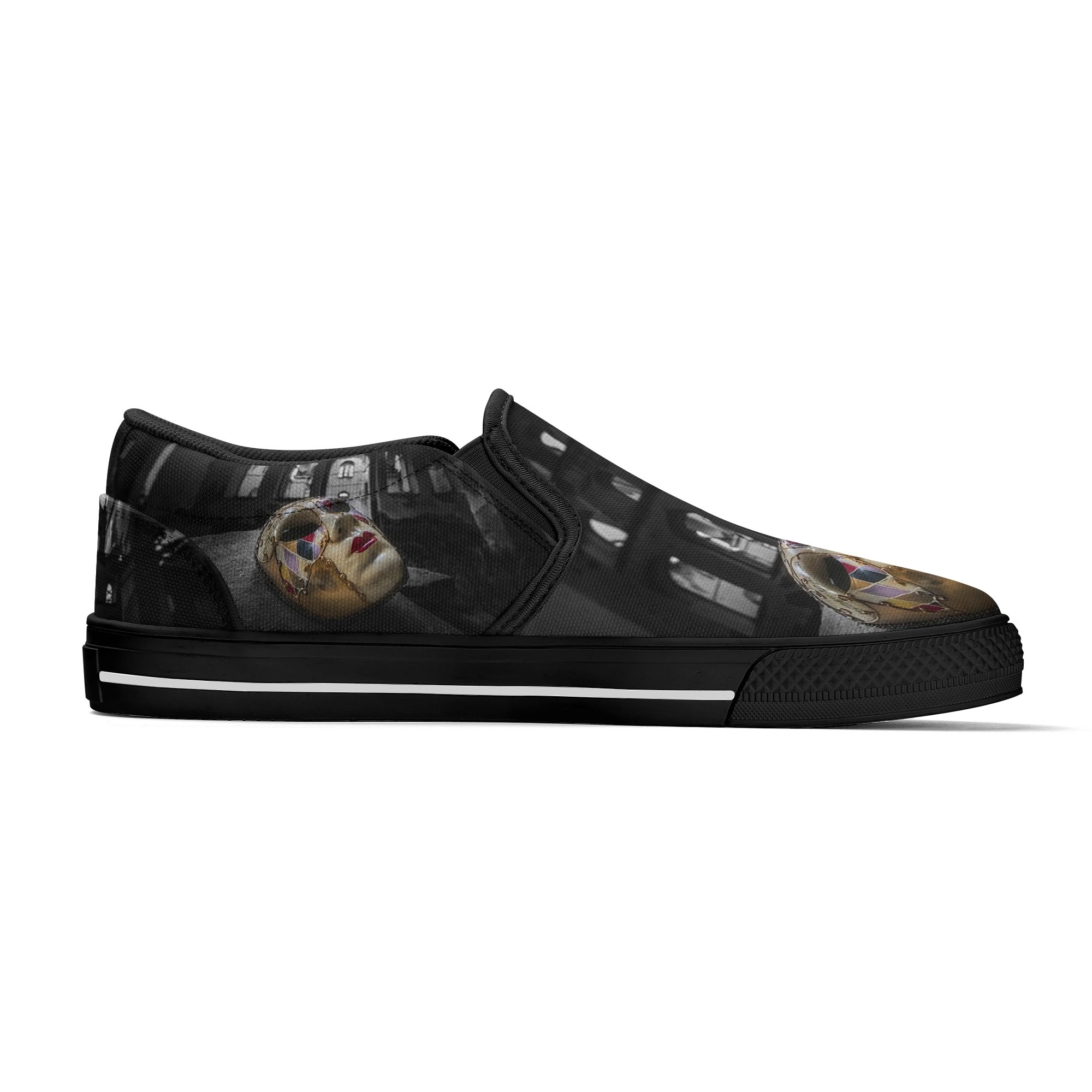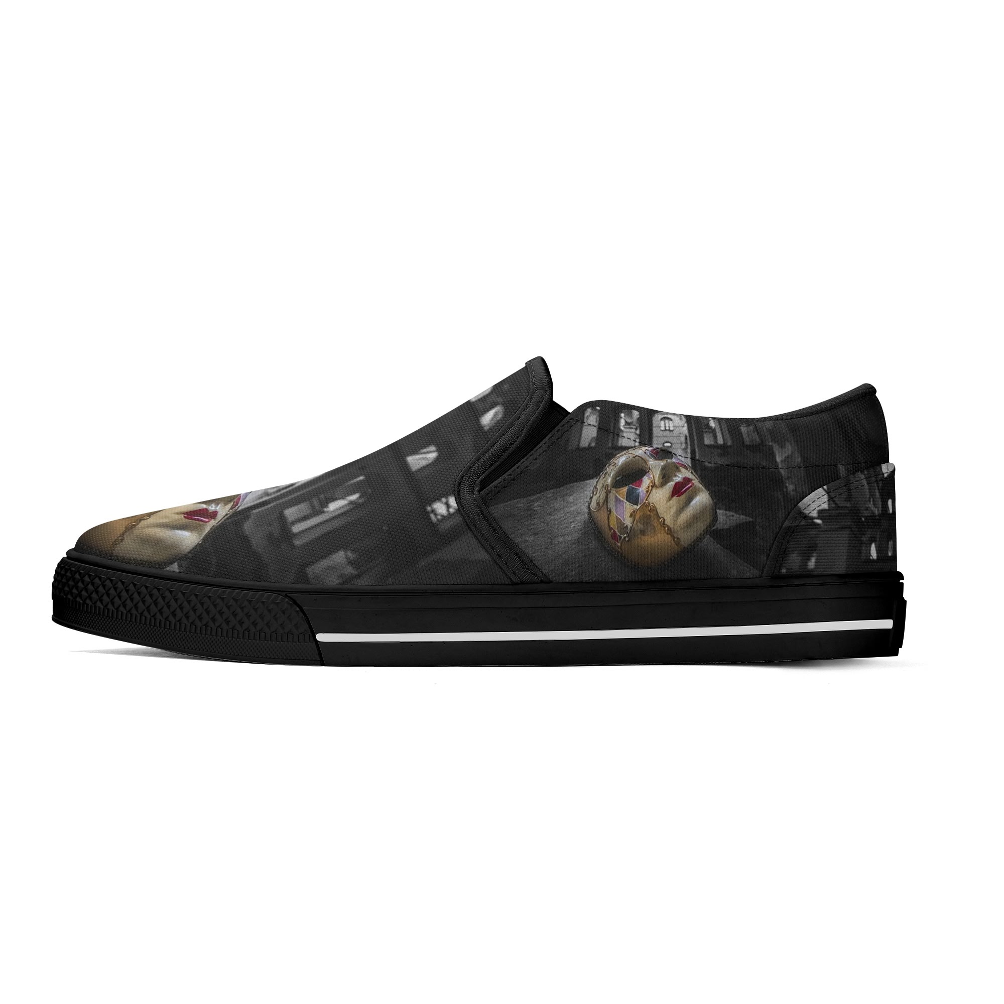 * Custom all over printed shoes with slip on style and elastic band construction for easy on and off.