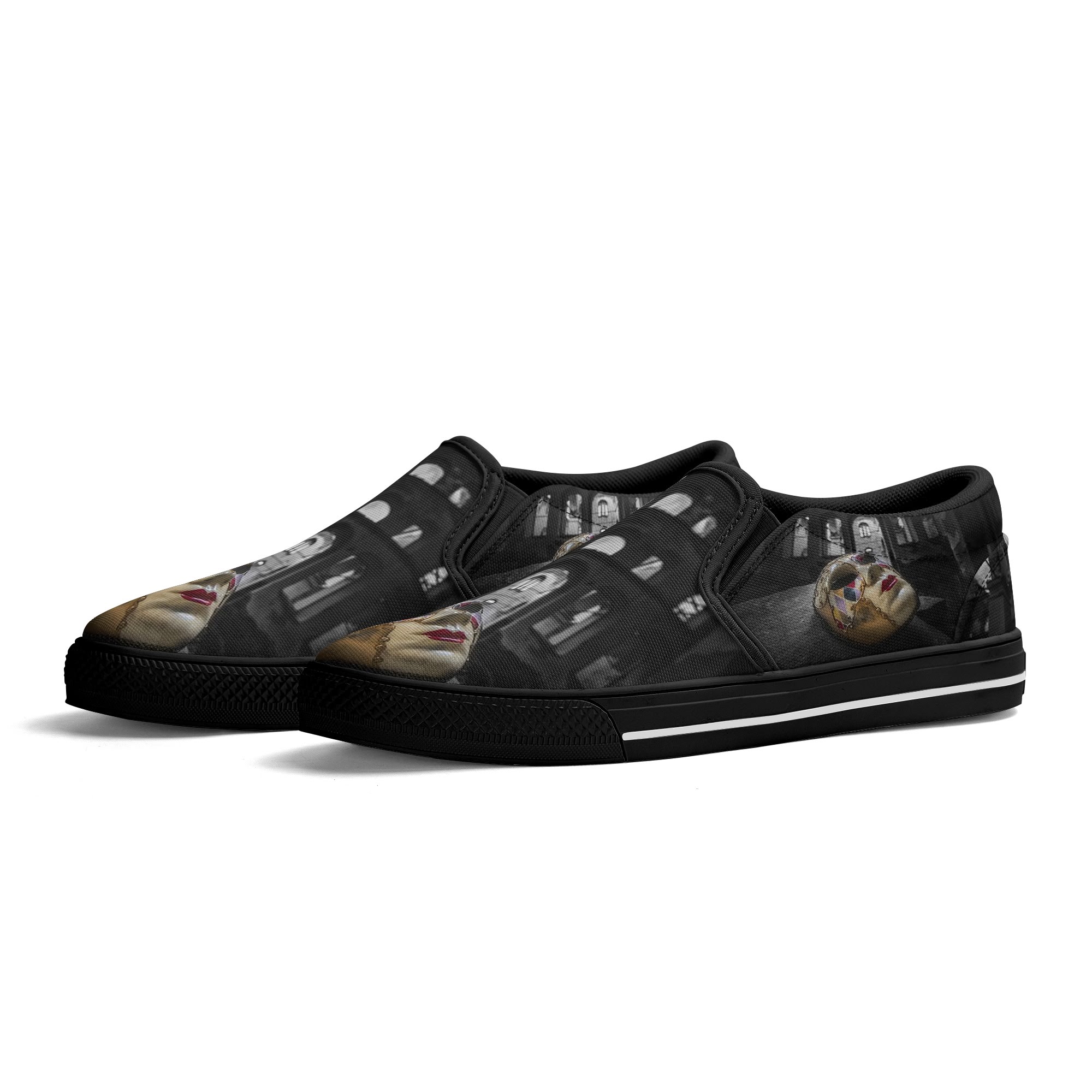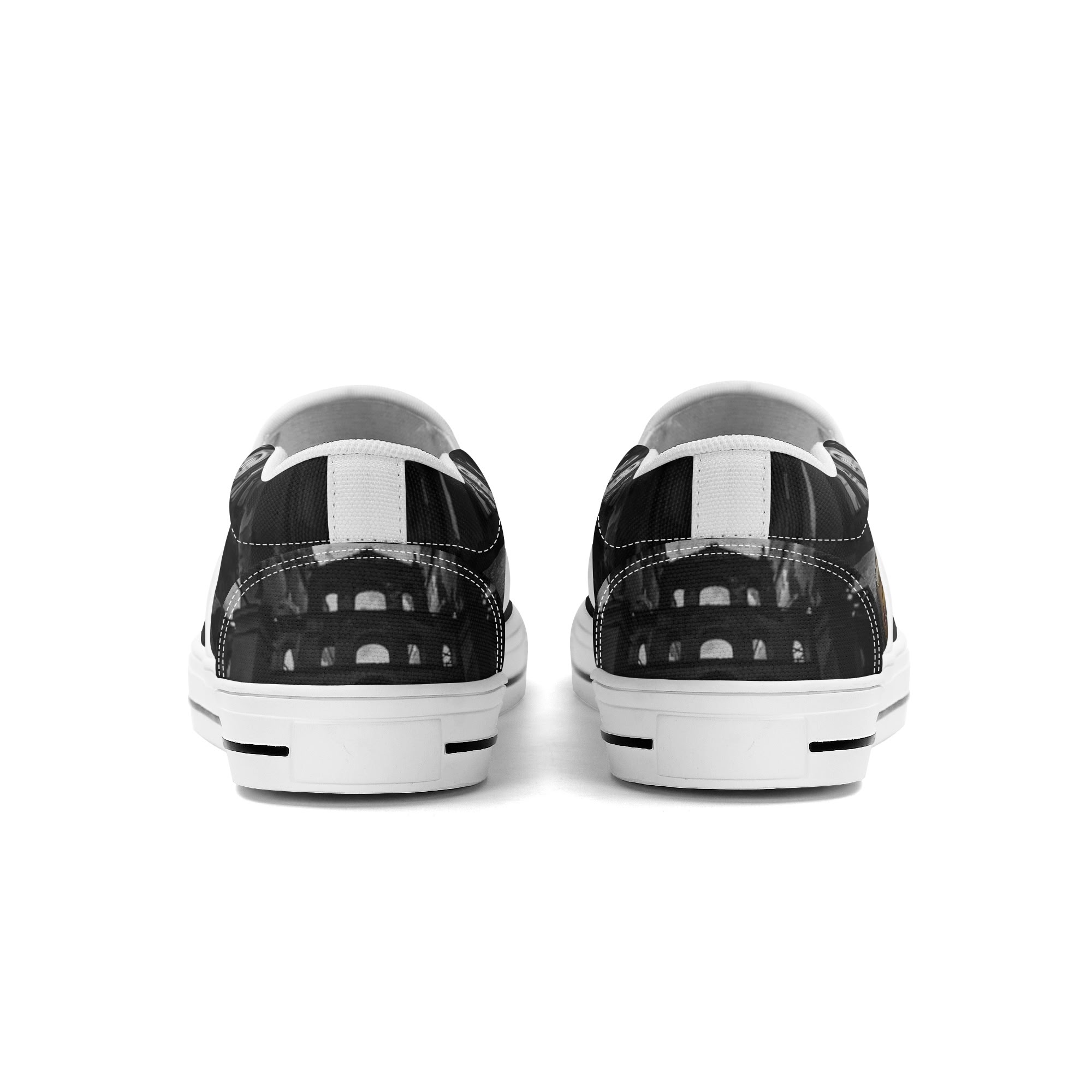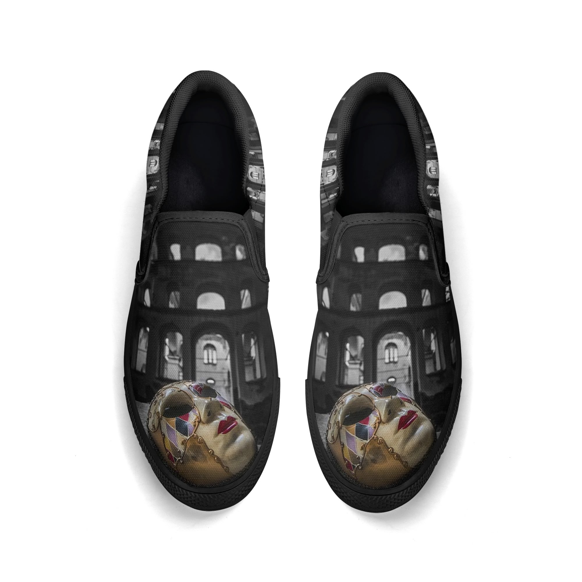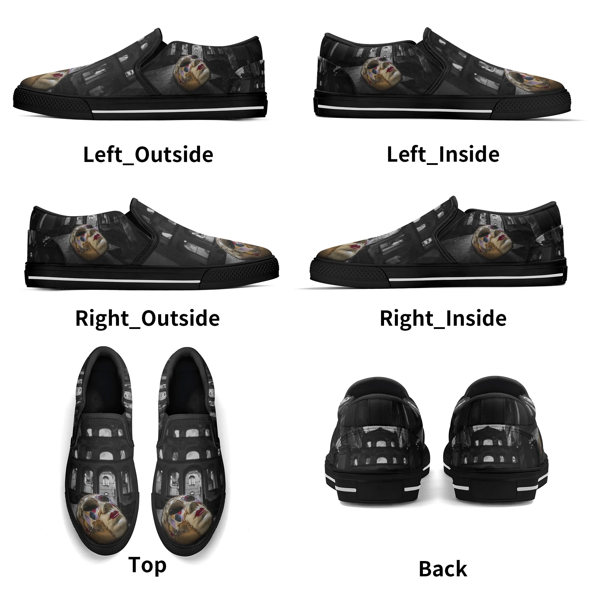 * Custom all over printed shoes with slip on style and elastic band construction for easy on and off.